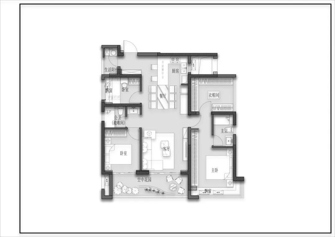 可将次卧改造为衣帽间,形成功能更完善、尺度更宽奢的『小家化』套房主卧,集休憩、观景、沐浴、收纳等多功能于一体,为居者带来更高的舒适享受。