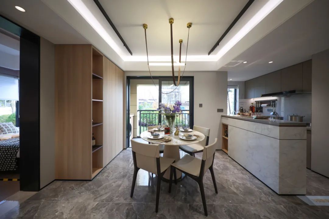 餐厅和客厅相较于传统的空间区隔,打破常规,约3.7M可拓展至约6.5M的超宽开间客厅,使整个空间更加开阔,客厅沙发买大一点,餐桌长一点,也不用担心空间局促。足够的空间,是一家人其乐融融的公共厅,也是宴请宾客的私人会客厅。