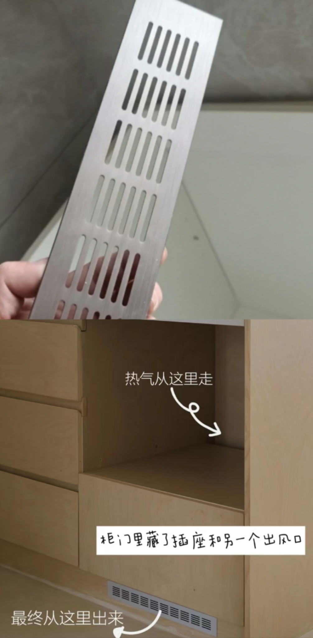如果柜门上下还有空间,可以安装一个【排气格栅】,如果没有空间,可以把层板后面锯掉5公分,然后在踢脚板上安装排气格栅。