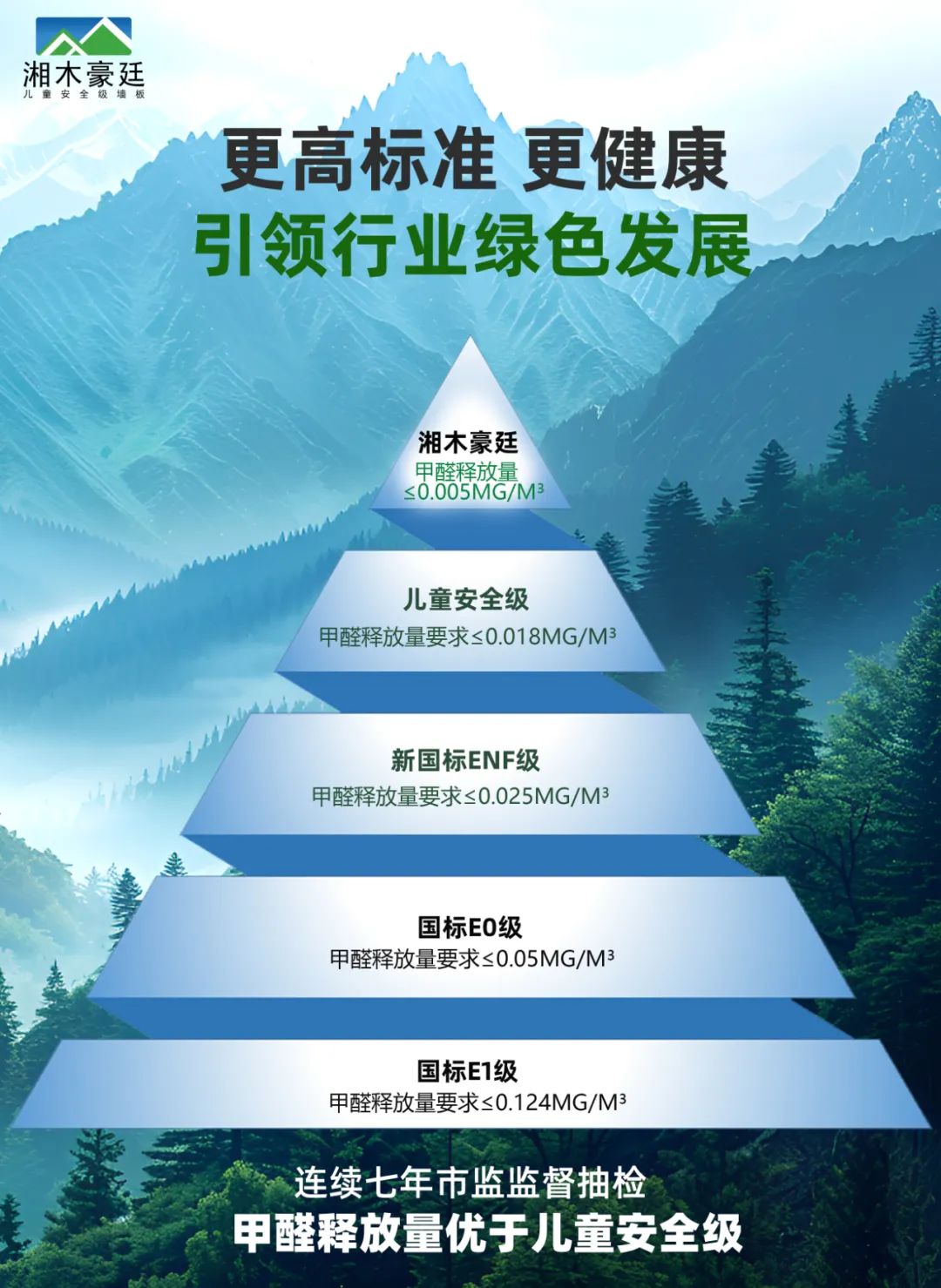 湘木豪廷按照国标(GB/T35612--2017《绿色产品评价》)生产,这是目前世界室内装饰材料最严环保标准,比新国标ENF级还严。产品连续7年市监部门抽检,各项环保性能指标合格,甲醛释放量0.002--0.005mg/m3,优于国标。湘木豪廷无醛添加板材,更能给家人一个安全健康的家!