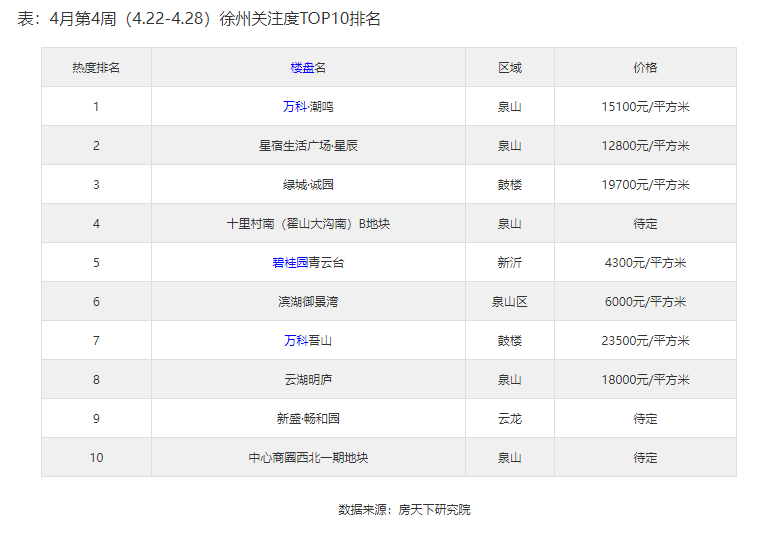 4月第4周(4.22-4.28)徐州新房热搜榜出炉!此次楼盘排名数据根据房天下用户浏览及关注度综合计算产生。