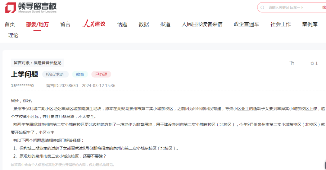 2024年4月,有网友在人民网地方领导留言板,有关于“上学问题”的投诉件: