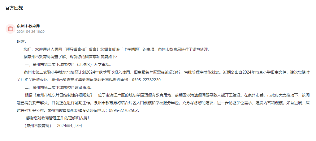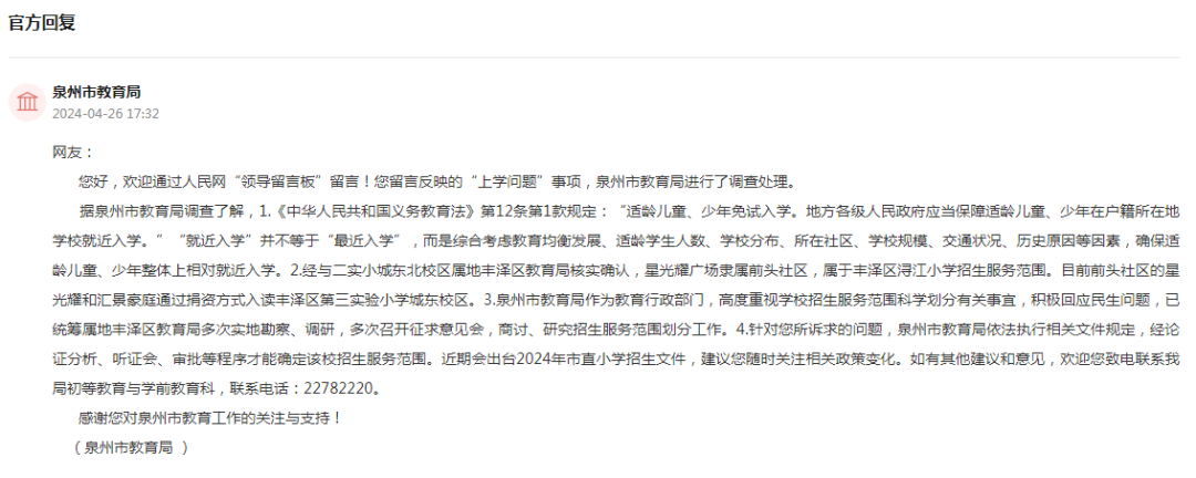 3、泉州市教育局作为教育行政部门,高度重视学校招生服务范围科学划分有关事宜,积极回应民生问题,已统筹属地丰泽区教育局多次实地勘察、调研,多次召开征求意见会,商讨、研究招生服务范围划分工作。