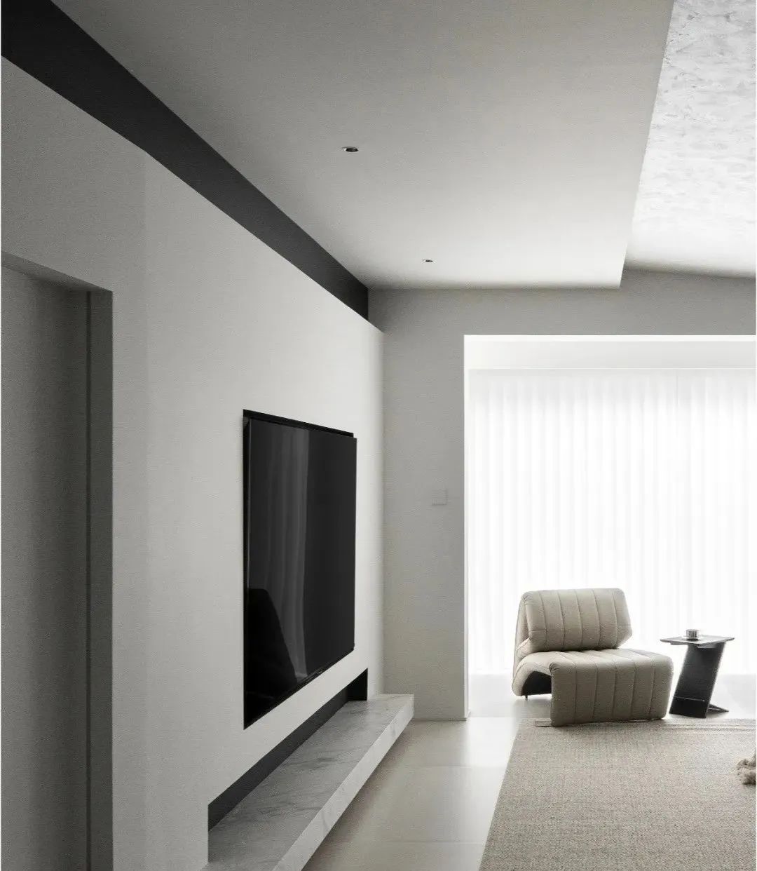 在电视墙处留白,使用色彩饱和度低的大理石或岩板,可以让视觉更加集中,大大提升观影体验: