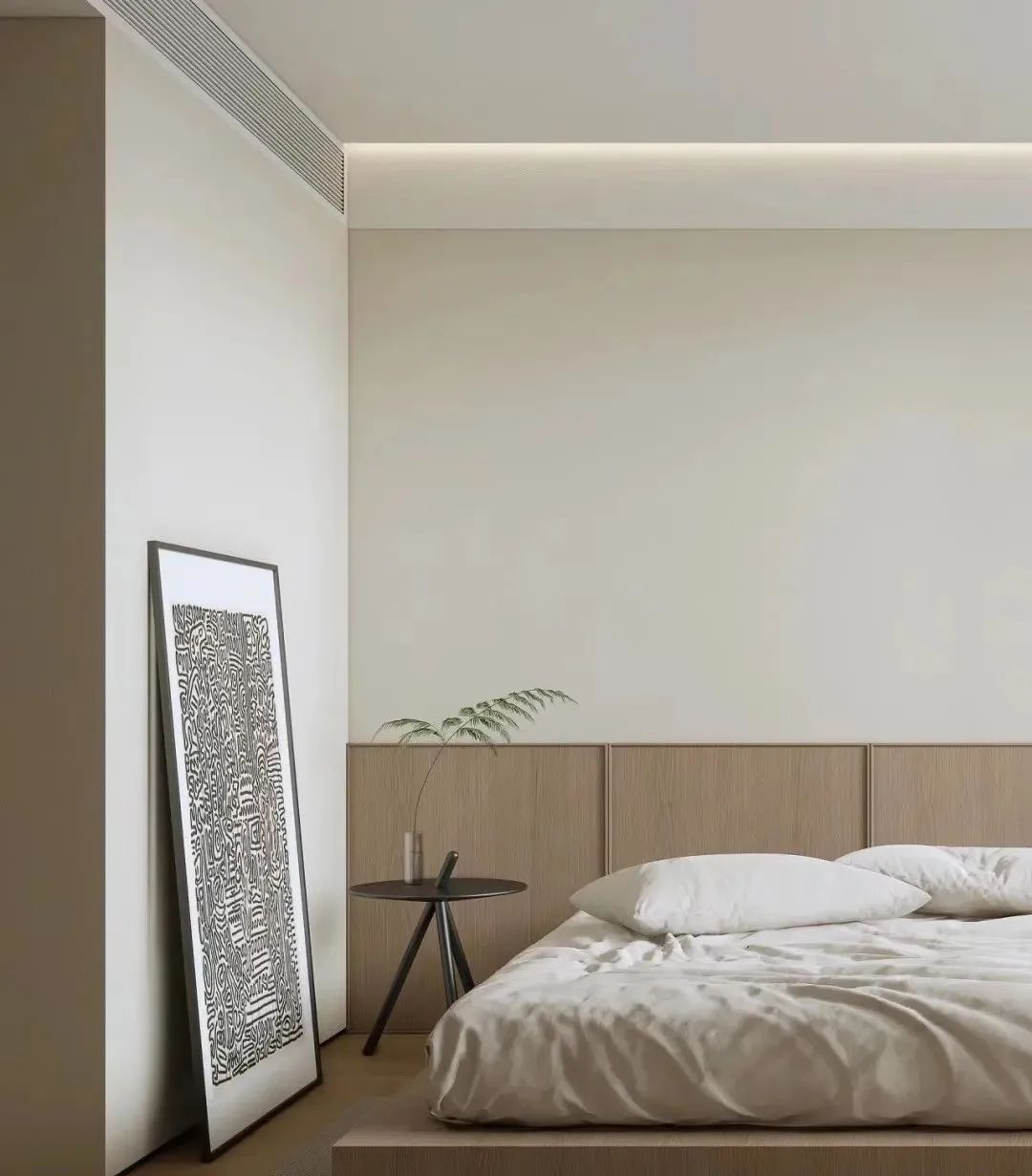 卧室空间留白,通过无主灯设计或是大面积素色铺排,来剔除一切不必要的装饰元素,让氛围更加舒缓柔和: