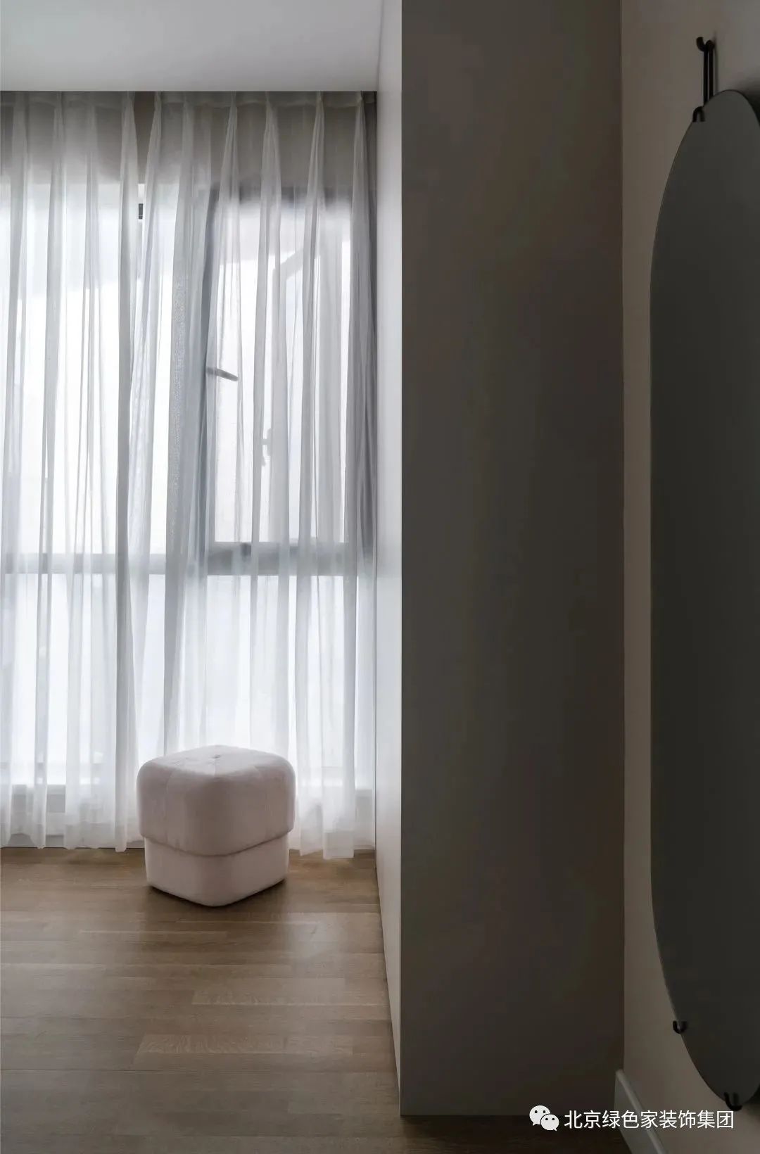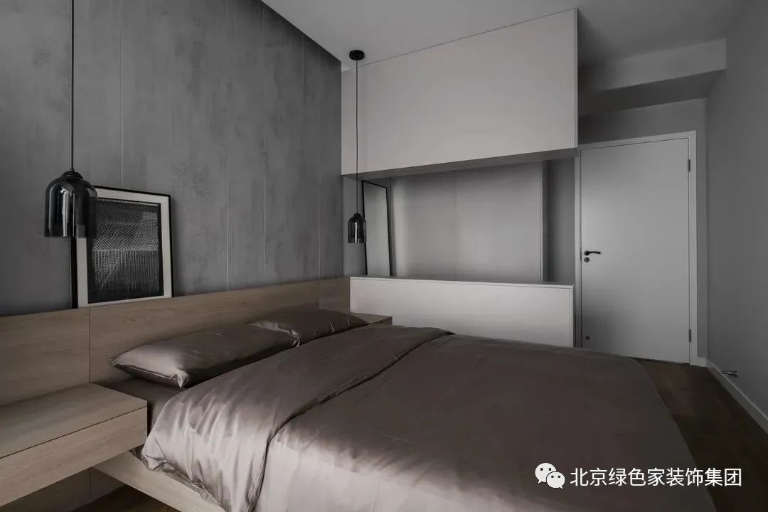 ▲丝绸灰的床单,木质床头靠背与床头柜一体定制,后方岩板灰质感的床头墙设计,靠放一幅灰色的装饰画,卧室门旁的吊柜+地柜组合,呈现出一种简雅舒适的气息。