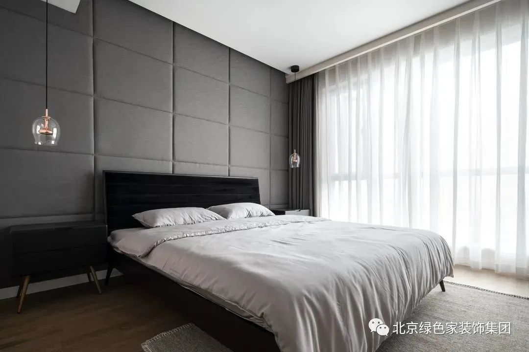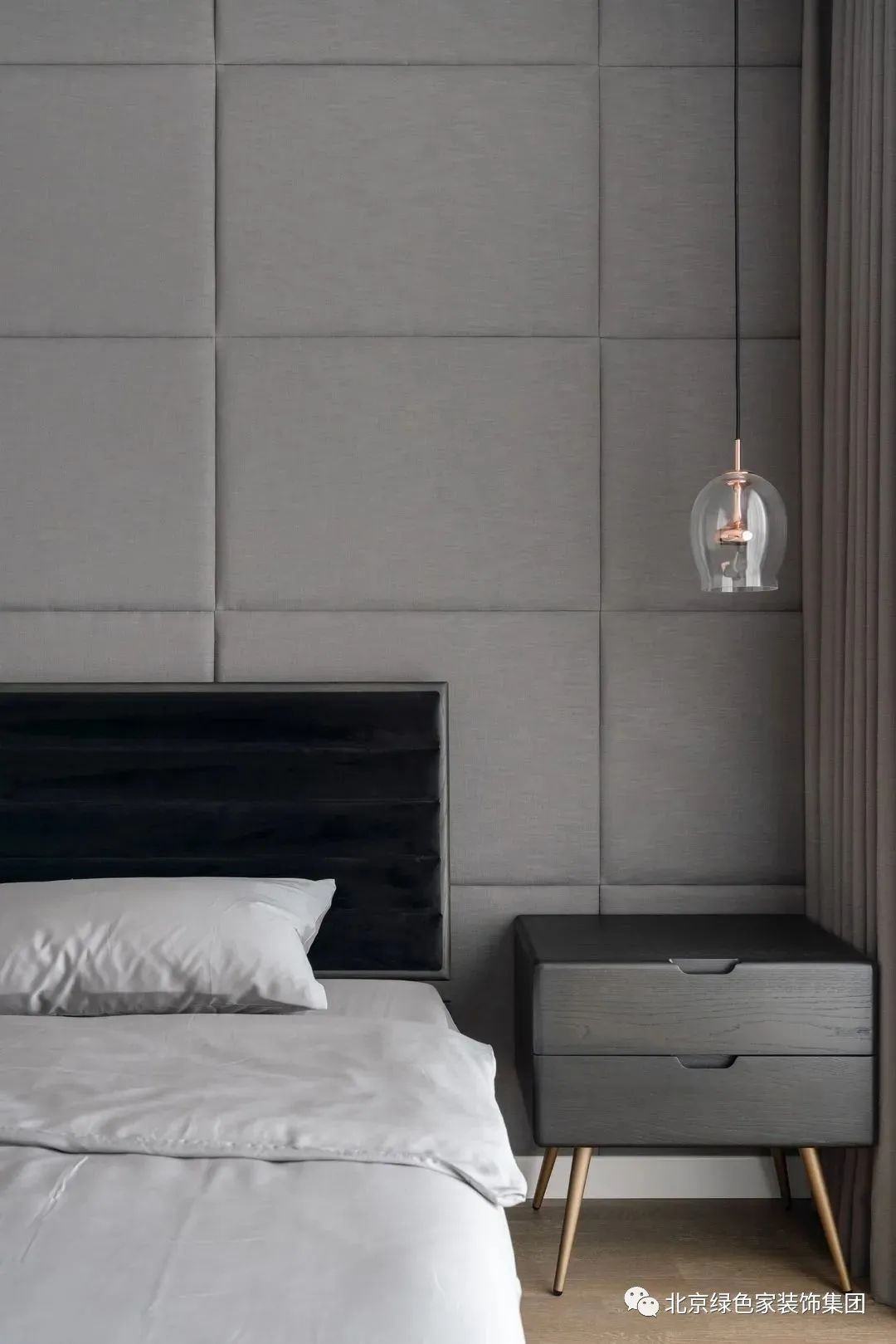 ▲灰色软包作为床头墙,搭配黑色的床铺、布置白色床单,黑白灰的空间,显得更加舒适时尚自然。
