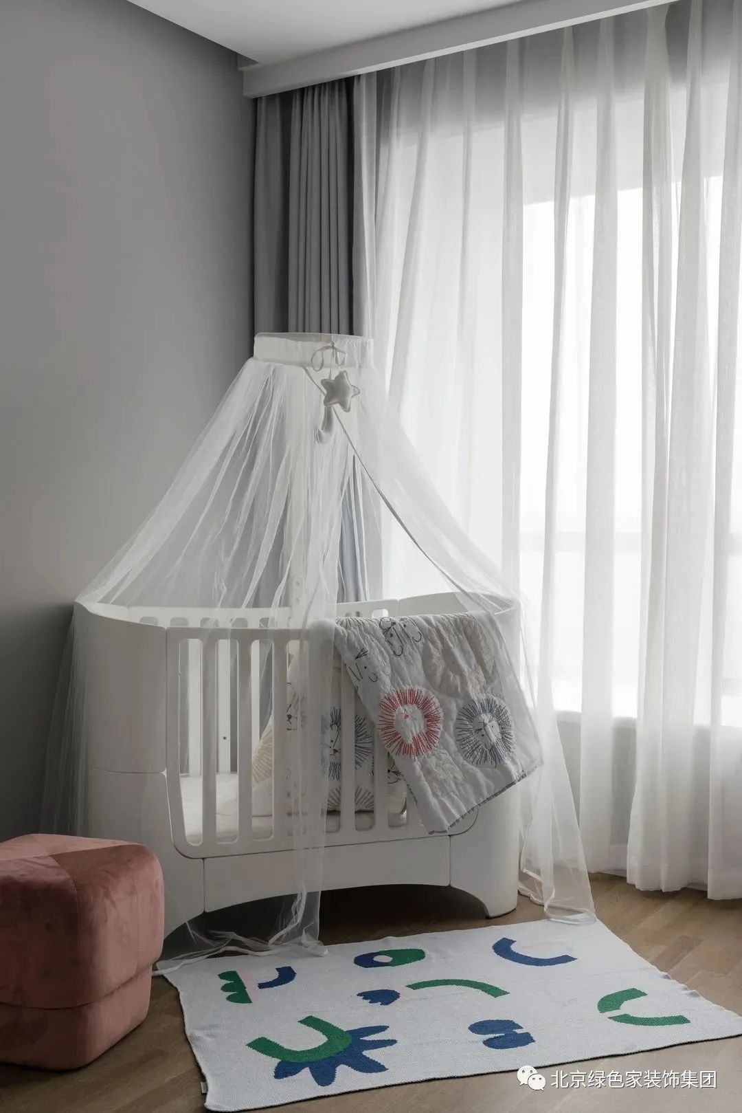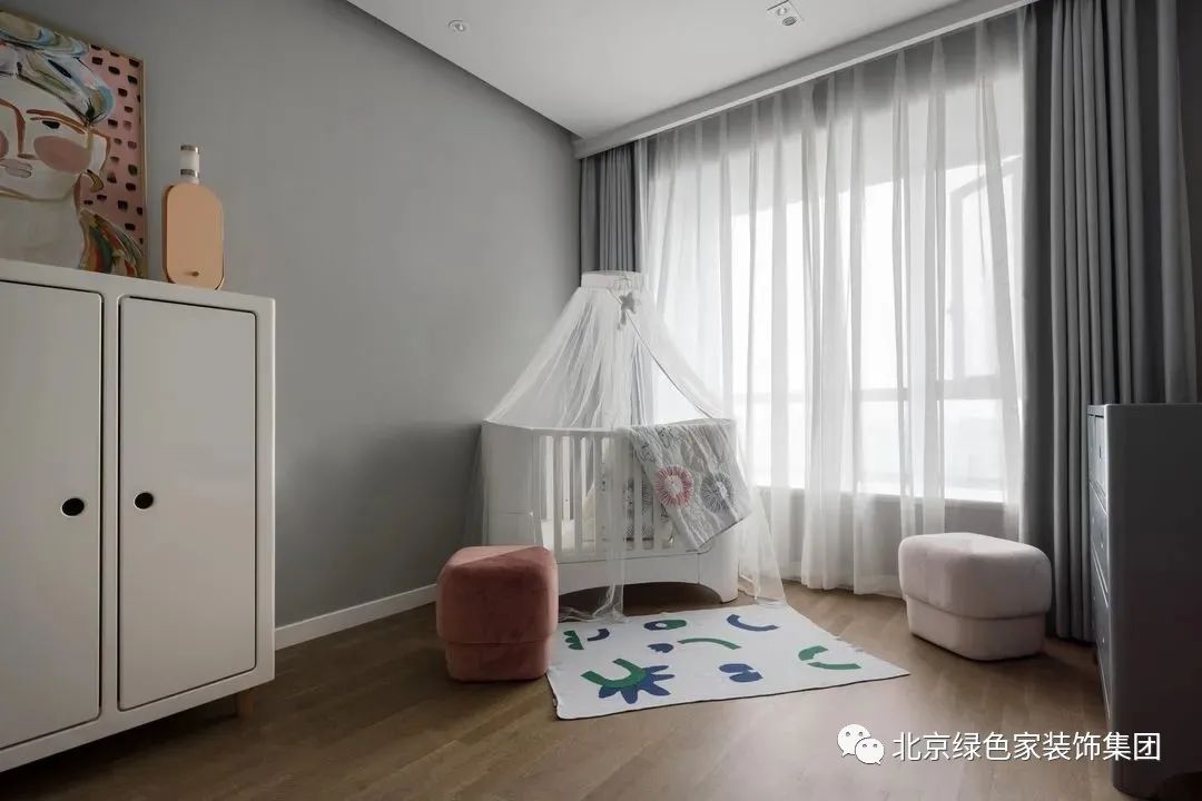 ▲儿童房也是以灰色的墙面与窗帘搭配,靠窗角落摆一个婴儿床,加上小斗柜的布置,还布置了粉色的小凳子,即为孩子提供了玩耍与睡觉的位置,也让大人可以坐在这里照料孩子。
