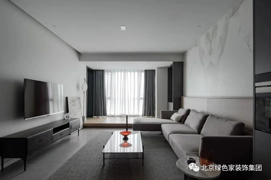 ▲客厅天花以吊平顶的设计,电视墙浅灰色的洁净墙面+深木色电视柜组合,沙发墙是岩板材质+灰色布艺沙发,整个客厅铺上灰色地毯,在灰白配的硬装与软装搭配下,呈现出一种朴素从简的现代空间感。