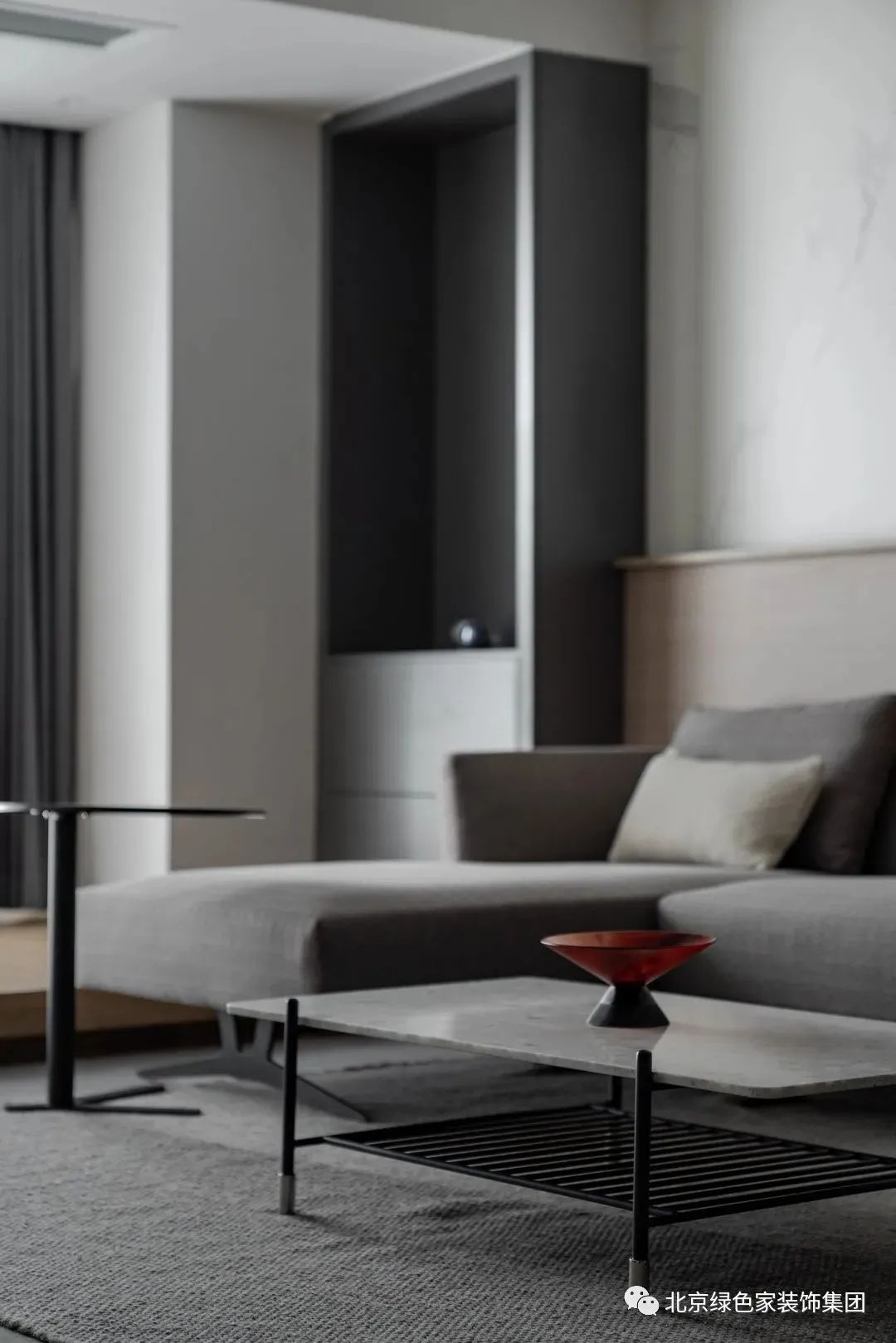 ▲灰色地毯上摆上灰色布艺沙发,客厅中间布置一张岩板台面的极简茶几,整个空间都充满简洁优雅的大方与舒适档次。