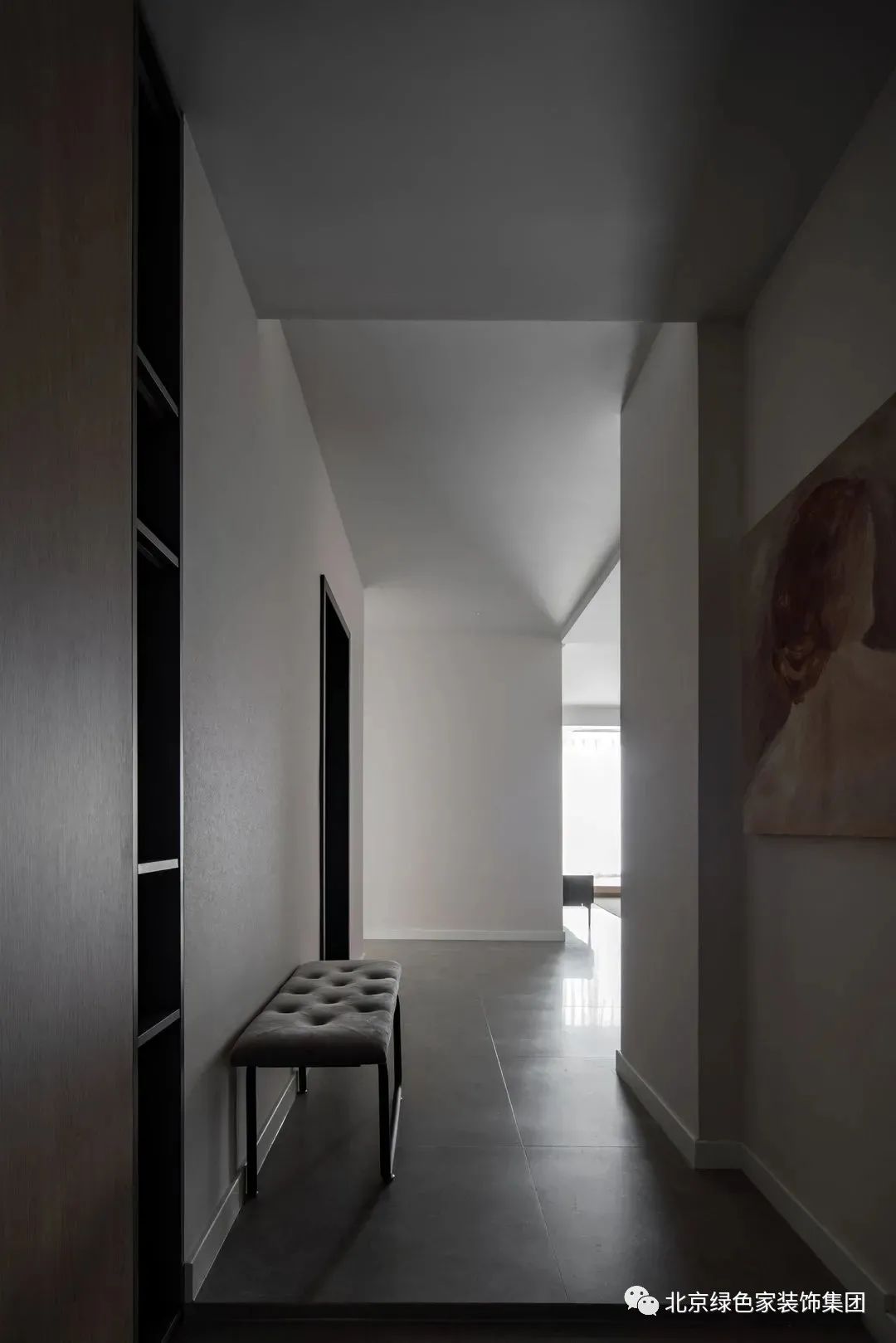 ▲玄关以灰色的地砖与浅灰色墙面设计,一进门就给人营造出一种极简舒适的空间感。左侧加入一个入墙式的开放格架,搭配上布艺板凳的设计,右侧挂一幅艺术抽象画,让人一回家就感受到一种从容简雅的空间氛围。