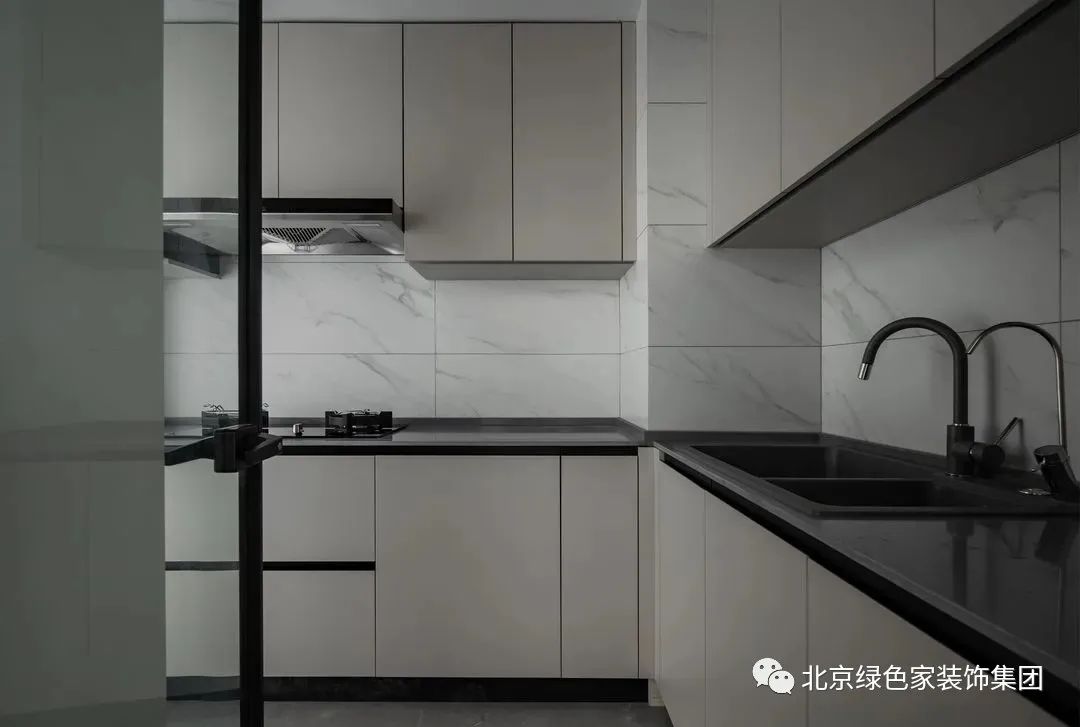 ▲厨房灰色地面+雅白墙面砖的基础,装上灰白色的定制橱柜+黑色的操作台台面,以L字形的操作台设计,为主人提供了一个简约优雅而实用方便的烹饪条件。