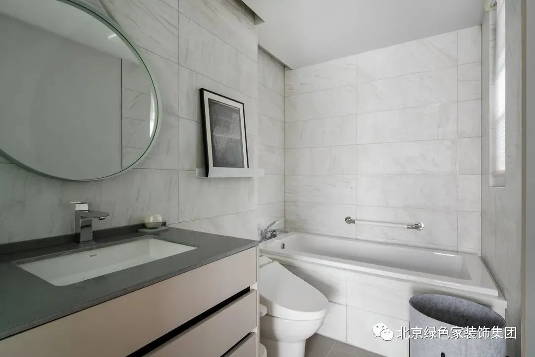 ▲卫生间在灰色的空间基础,装上一个浴室收纳柜,上方一面圆形的装饰镜,里侧布置马桶与浴缸,提供了一个安静舒适的卫浴空间。