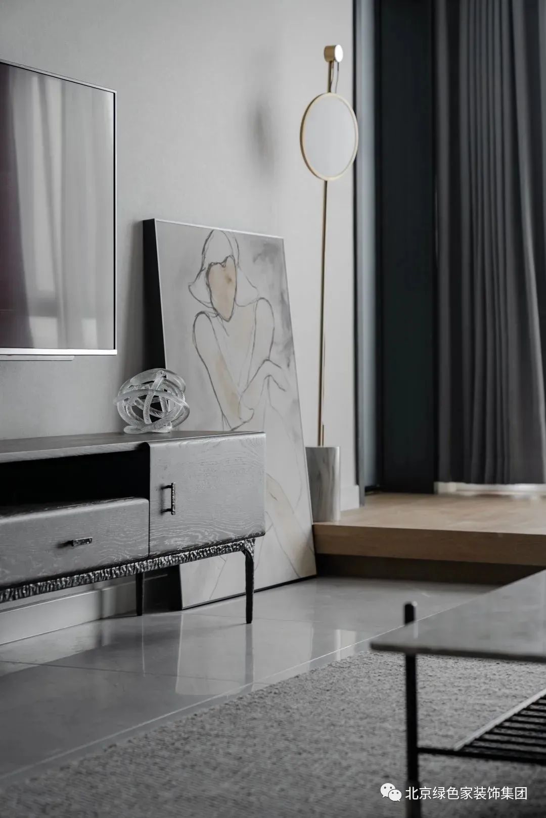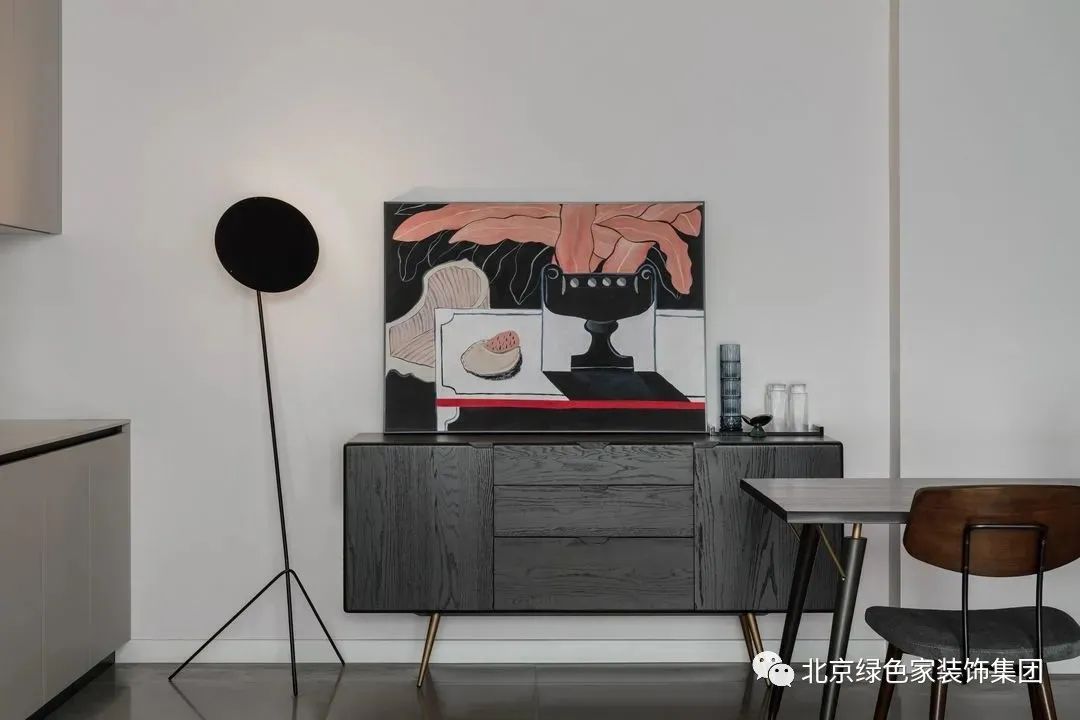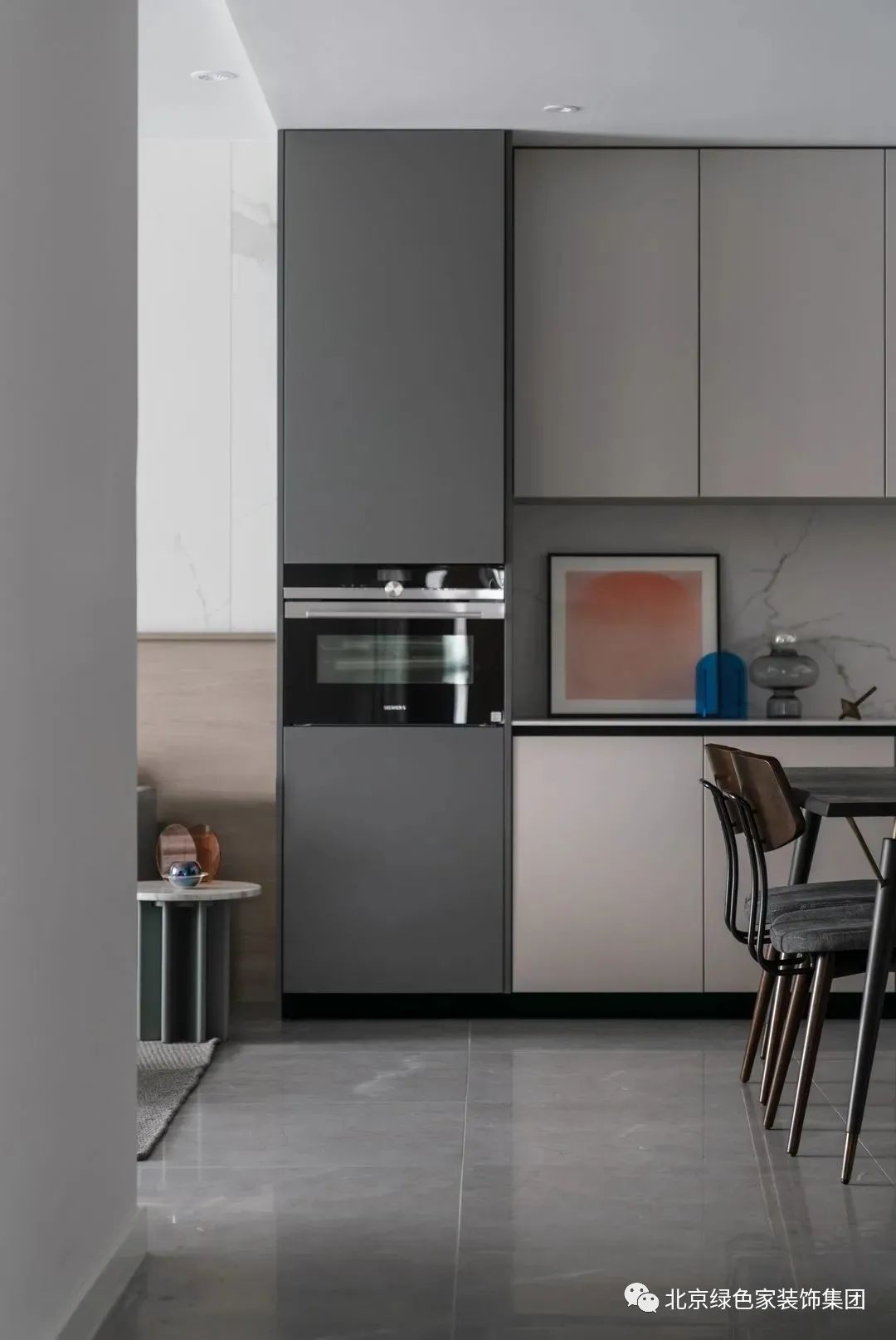 ▲餐厅的另一端以定制餐边柜的设计,并把电器嵌入到定制柜体里面;餐边柜中间留空的设计,布置上精致的摆饰品,在灰色定制餐边柜的空间下,也是显得极简而优雅。