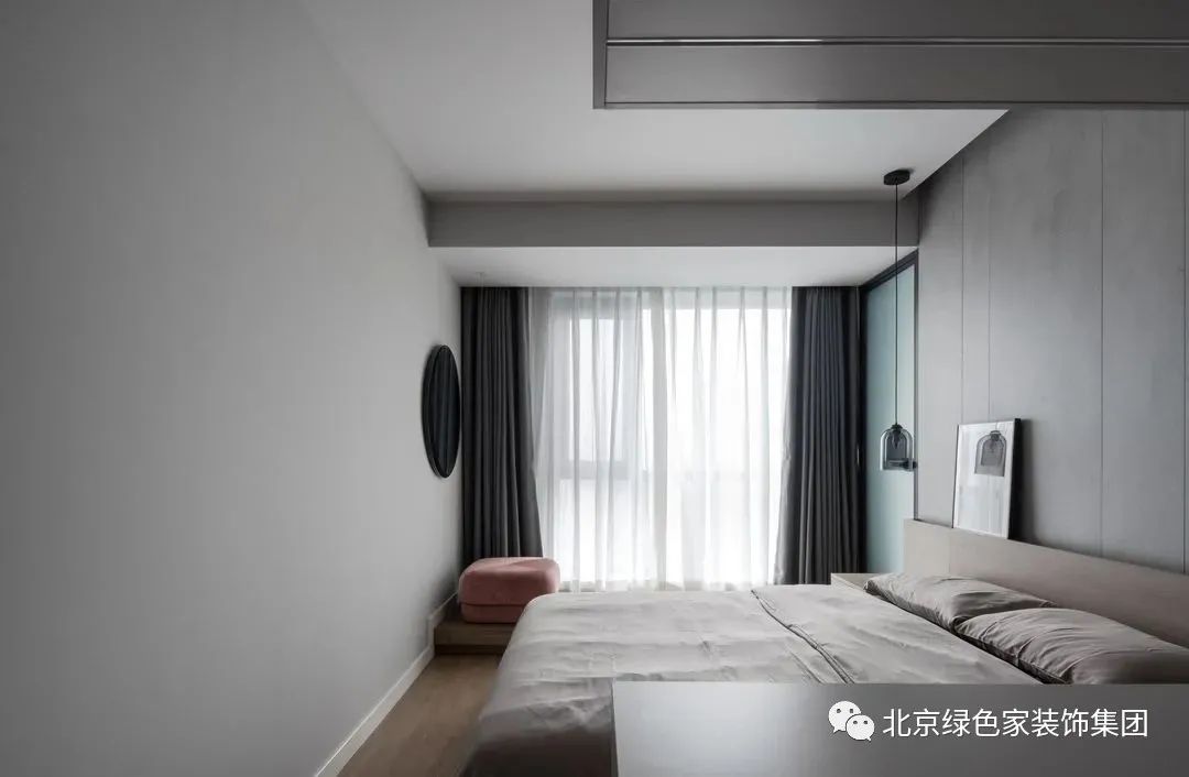 ▲次卧在灰色的墙面空间下,实木床+灰色床单枕头,还有灰色窗帘,并在窗边加入蓝色的墙面、布置一个粉色布艺凳,整个卧室充满简约的舒适氛围。