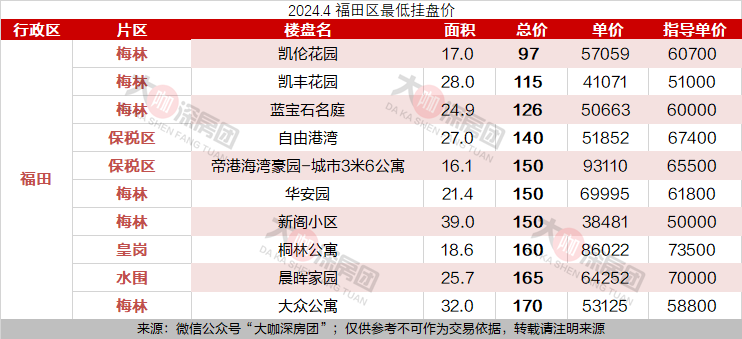 福田区的底价盘主要集中在梅林片区,此外保税区、皇岗、水围也有部分小区。福田区总价最低的是位于梅林片区的凯伦花园,该户型面积为17㎡,总价97万元,单价5.7万元/㎡,低于指导价0.3万元/㎡。单价最低的是梅林的新阁小区,面积39㎡,总价150万元,单价3.8万元/㎡,低于指导价1.2万元/㎡。