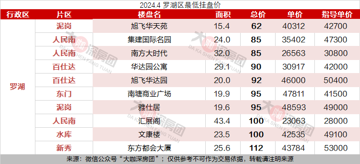 罗湖区低价盘集中在人民南片区,泥岗、百仕达、东门、新秀、水库片区也有部分挂盘。