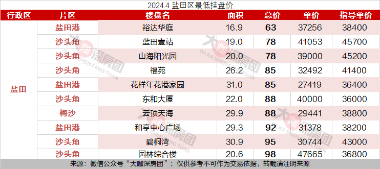 总价最低的是盐田港片区的裕达华庭,面积16.9㎡,总价63万元,单价3.7万元/㎡,低于指导价0.12万元/㎡。