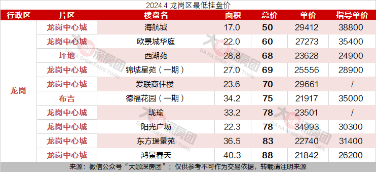 单价最低的是龙岗中心城的鸿景春天,该挂盘的面积为40.3㎡,总价为88万元,单价为2.2万元/㎡,低于指导价0.44万元/㎡。