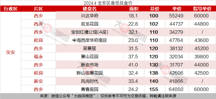 单价最低的是位于西乡片区的新安市场,面积41㎡,总价130万元,单价3.2万元/㎡,低于指导价1.2万元/㎡。