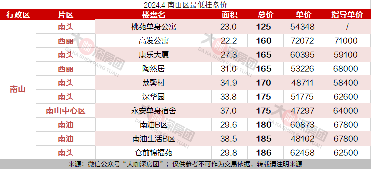 南山区底价盘集中在南头片区,南油、西丽、南山中心区也有部分挂盘。总价最低的挂盘是南头片区的桃苑单身公寓,面积为23㎡,总价125万元,单价为5.4万元/㎡。单价最低的是南山中心区的永安单身宿舍,面积为37㎡,总价175万元,单价为4.7万元/㎡,低于指导价1.7万元/㎡。