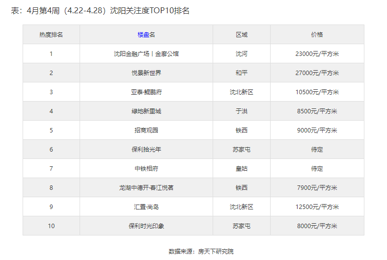 4月第4周(4.22-4.28)沈阳热搜楼盘排行榜出炉。