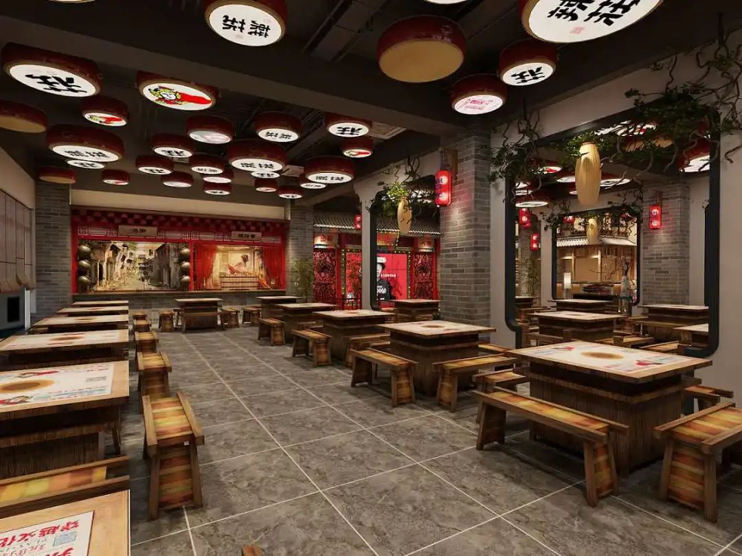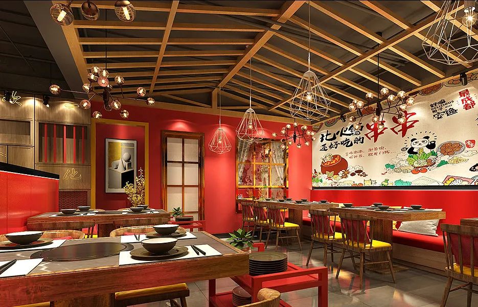 为了让火锅店看起来更有氛围感,我们还可以在餐厅内挂一些装饰画,诸如当地饮食文化海报、富有趣味的山水人物画等,以此提高火锅店的整体形象。与此同时,火锅店的整个装饰风格也是非常重要的,对大厅、吊顶、选用的灯光装饰效果都要进行全方位考量,配色方案最好能体现轻盈、亮堂的效果。