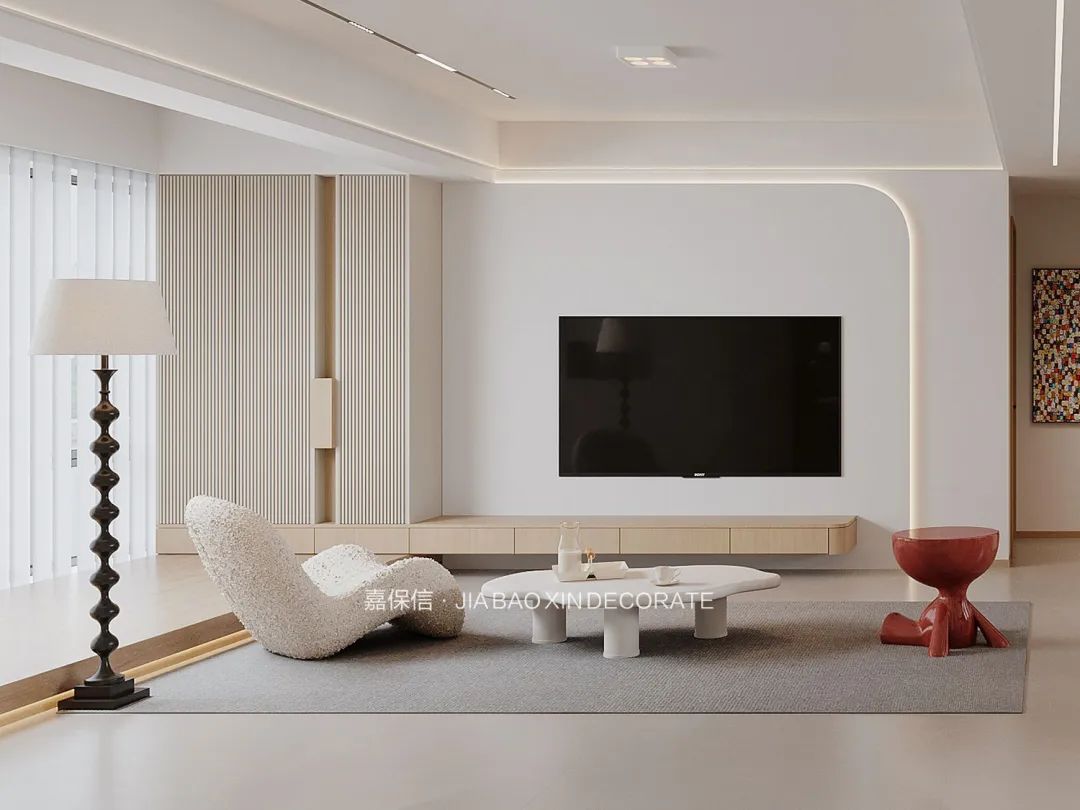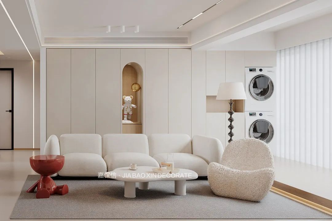 客厅,一袭纯色背景墙上,弧线柔美地勾勒空间的温婉,与深邃黑电视墙交相辉映,悬空电视柜以木的肌理触感,携手格栅、异形家具,围塑出一片既现代又质朴的会客天地。阳台与室内的界限被智慧模糊,实木收纳墙与嵌入式洗烘机,展现出设计师对于这个现代原木风家居的巧思,而那一抹奶白,沙发、茶几、地毯,三者相融,绘出一幅悠然闲适的午后时光画卷。