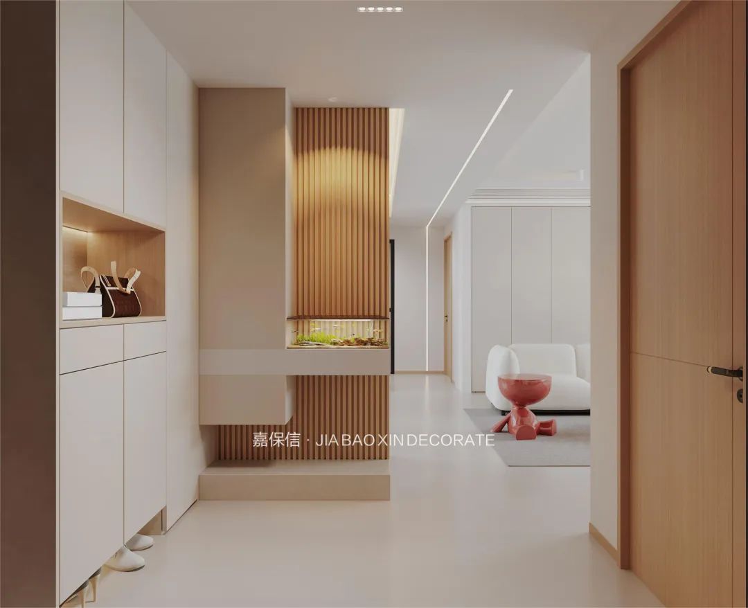 推门而入,玄关宽敞通透,一面至顶定制的纯色衣柜静默伫立,其下空灵设计,优雅收纳日常琐碎,美学与实用并蓄。转角处,一帧活水小景悠然映入眼帘,隔断上的鱼缸轻曳生趣,为这个温馨的现代原木风家居添上一抹生动与清新,心灵的尘埃在此缓缓落定。