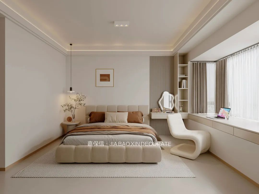 步入卧室,设计师对这个现代原木风家居的匠心独运跃然眼前。飘窗变身多功能空间,集读书角、梳妆台于一身,无主灯设计让光线如细雨般温柔洒落,与暖色床品、绒软地毯及艺术挂画共谱一曲关于慵懒的低吟浅唱,这里是梦开始的地方,也是心灵得以深沉安放的港湾。