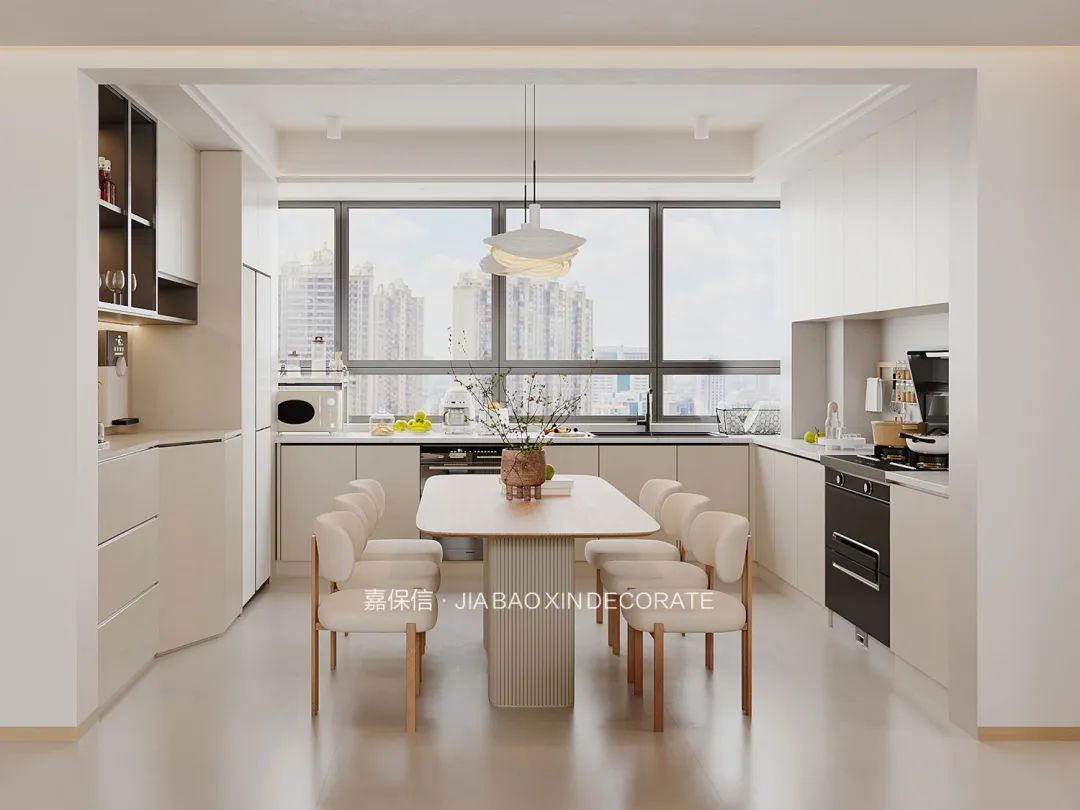 餐厨一步相连,木质餐桌与摩登餐椅相依偎,在光影的沐浴下,每一餐都仿佛置身于艺术画廊。厨房布局开放,动线行云流水,东西方烹饪文化在此碰撞结合,不仅简化了生活步骤,更丰富了餐桌上的风景,让人们在这个现代原木风家居的每一次下厨都成为创意与爱的传递。