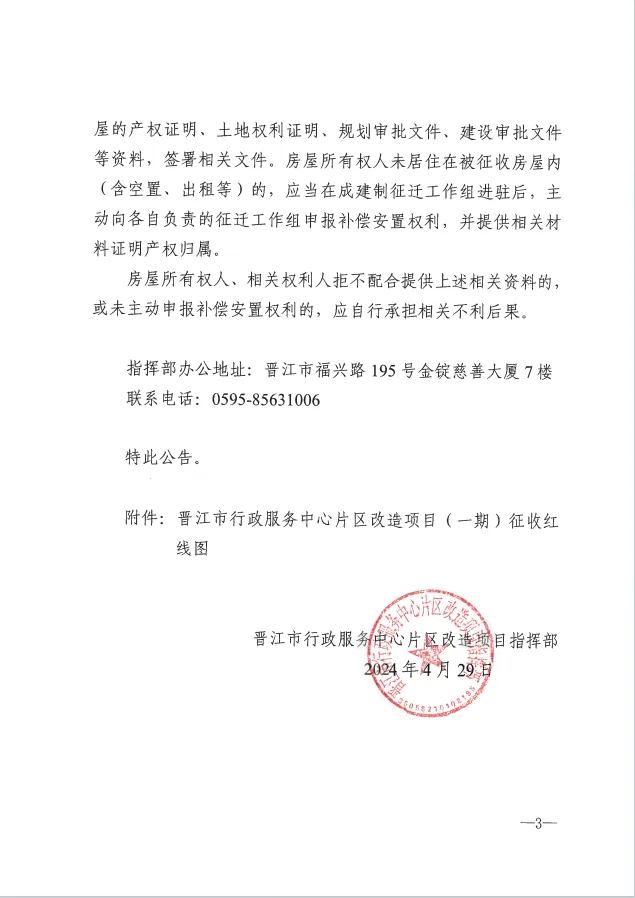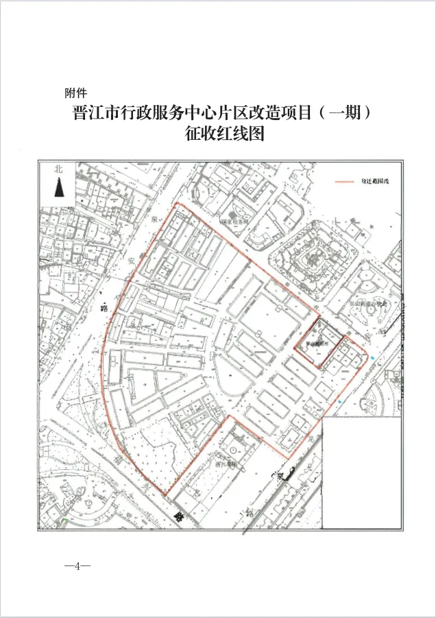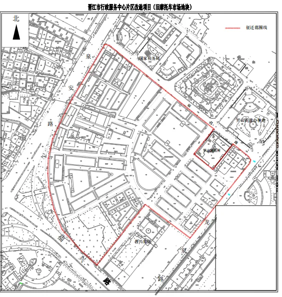 具体详见《晋江市行政服务中心片区改造项目(一期)征收红线图》。