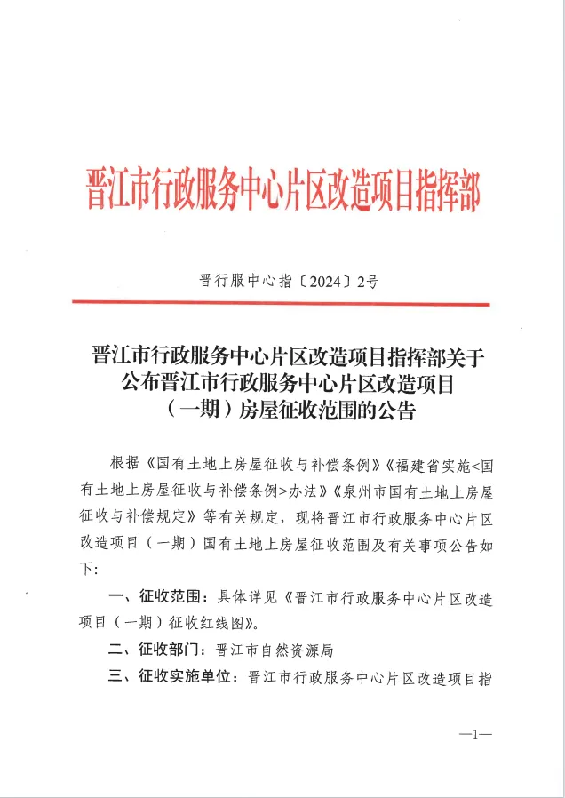 根据《国有土地上房屋征收与补偿条例》《福建省实施<国有土地上房屋征收与补偿条例>办法》《泉州市国有土地上房屋征收与补偿规定》等有关规定,现将晋江市行政服务中心片区改造项目(一期)国有土地上房屋征收范围及有关事项公告如下: