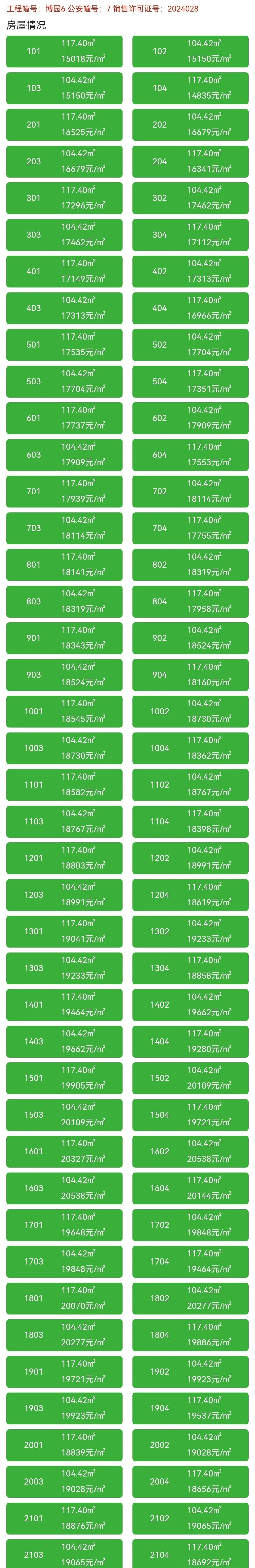 博园6#楼共84套高层(21层),户型建面约104㎡、117㎡,备案价14835元/㎡-20277元/㎡。