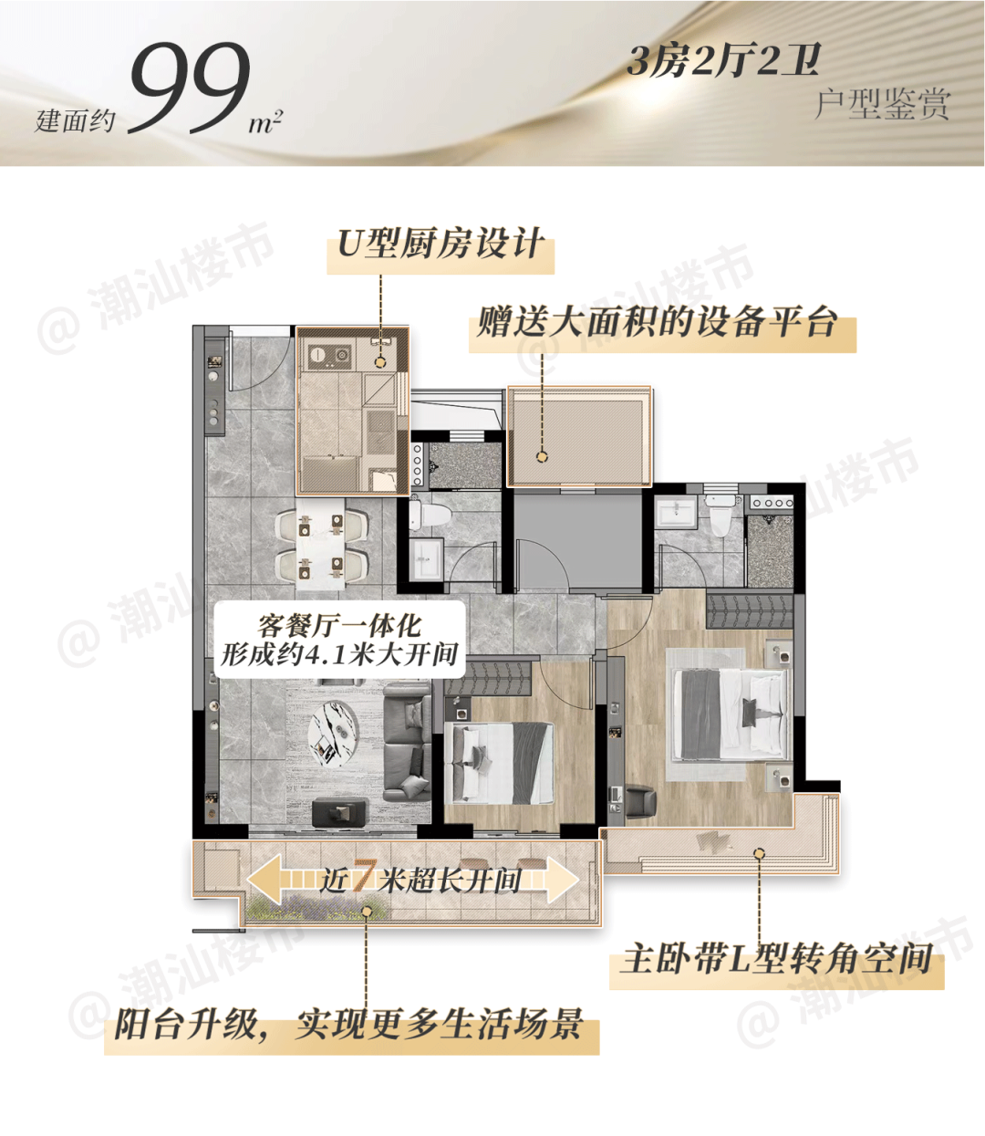 而其余细节设计,基本囊括了买家的生活需求,餐客厅一体化、U型厨房、双明卫等,主打一个功能性强。