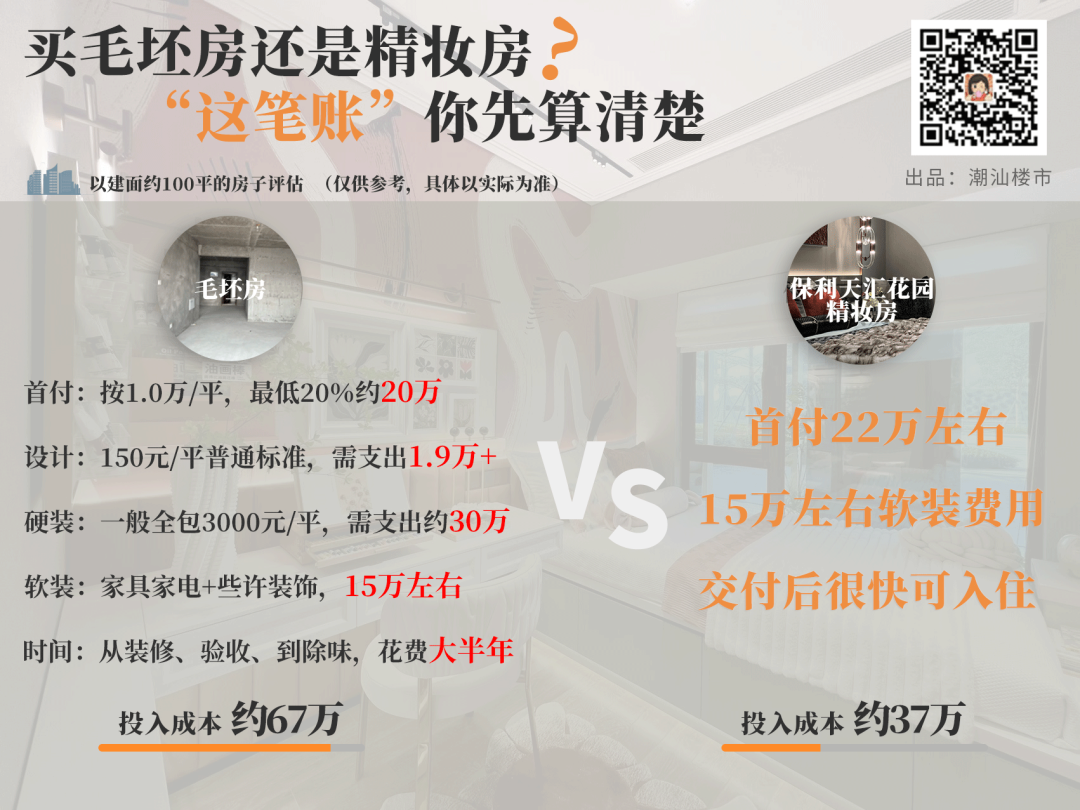 反观另一边,花约22万的首付款,购入一套相同面积段的精妆房,既不用费心费力,也可以尽早入住。这样一对比,保利天汇花园的价值,是不是一下子就出来了?