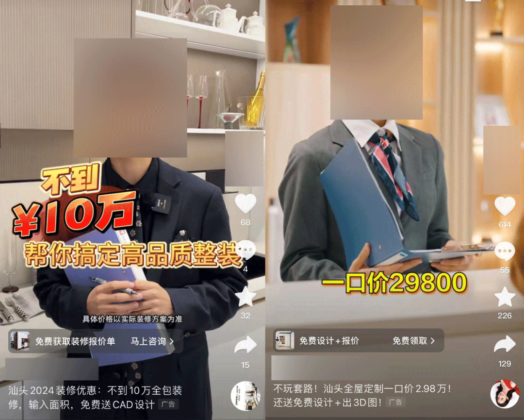 相信不少毛坯房业主,装修期间都刷到过各种家装广告,就如下图:不到10万搞定整装、全屋一口价两万+。