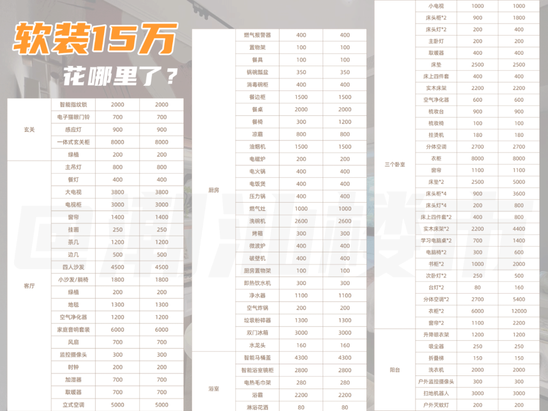 然而,实际装修才后知后觉,首付约20万买一套建面约100㎡户型,从前期设计费,到材料采购、人工等,零零碎碎的费用加起来,至少二三十万。别忘了,还有后期的软装费用,房姐参考了同事A的购物清单,粗略一算就接近15万。