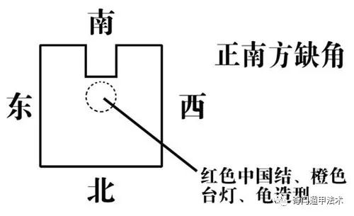 正南方为离宫,代表中女之位,如果此处缺角会对家中中女健康学业不利,因南方为离宫五行属火,需要注意心脏已经眼睛方面的疾病,并在巳午未年流年落空,运程不遂,此年月不利事业发展。
