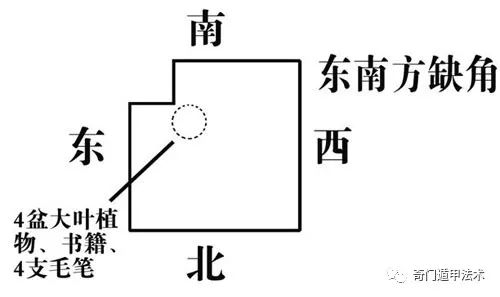 化解方法:在东南方摆放4盆大叶植物、书籍、4只毛笔