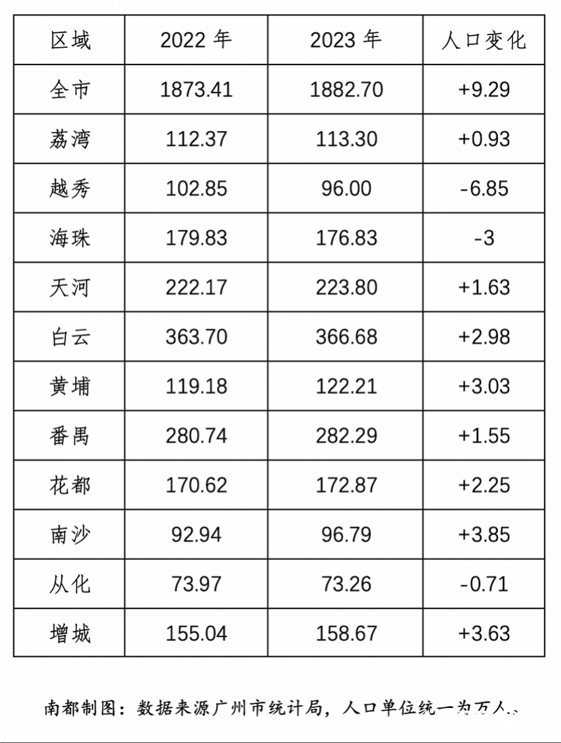 4月初广州市统计局公布的数据显示,2023年末广州市常住人口1882.7万人,比上年增加9.29万人,其中户籍人口比上年增加21.7万人,增速基本保持稳定。在目前已经披露了去年常住人口数据的国内城市里,广州常住人口的增量排名前列,继续以强大的人口虹吸能力吸引年轻人前来追逐人生梦想。这些数据也证明去年一度传言的“逃离一线城市”的现象其实并不存在。除了常住人口继续增长之外,本次广州公布的人口数据还有许多其它的亮点:与全国出生率下行的趋势相比,广州户籍人口出生率和自然增长率均明显高出总体水平,广州人敢生娃的趋势依然保持;此外,细看广州常住人口增量在十一区的分布情况,过去一直是人口流入大区的白云、番禺已经不再躺赢,新的人口流入大区正在逐步崛起。