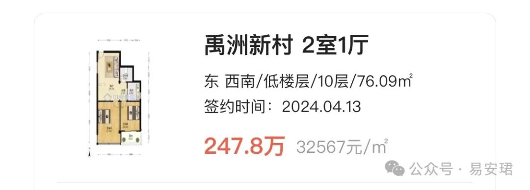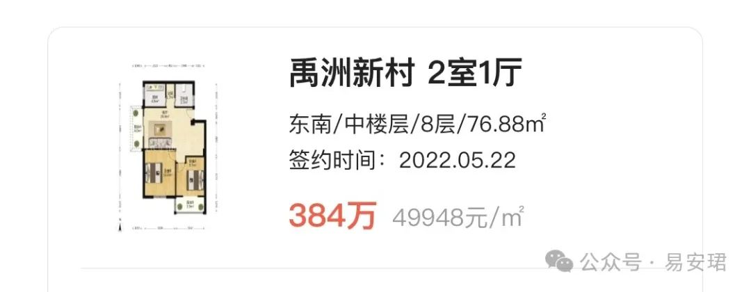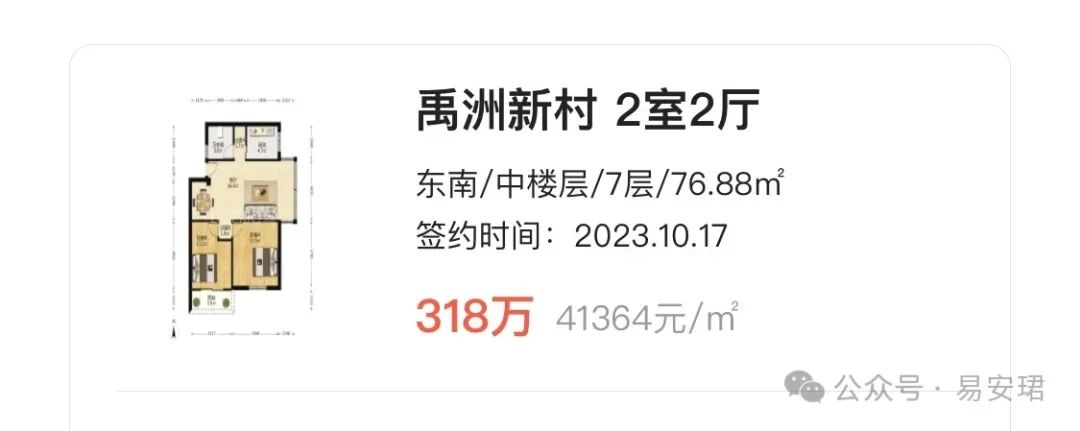 11、湖里南山路——禹洲新村,76.09平2房,成交单价32567元/平,成交总价247.8万;去年10月相似户型成交单价41364元/平,成交总价318万;只隔了半年时间,总价调整了70.2万左右。2022年相似户型成交单价49948元/平,成交总价384万;只隔了2年时间,总价调整了136.2万左右。