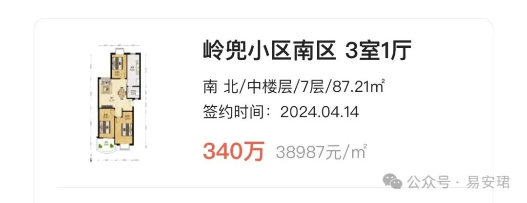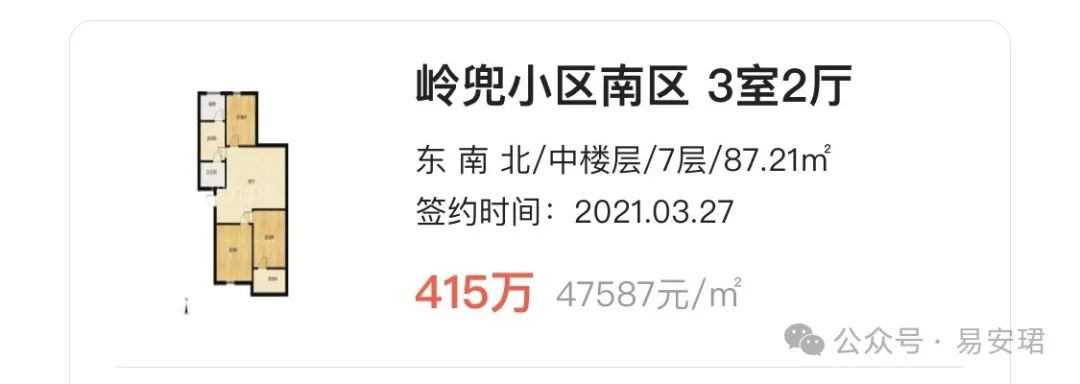 6、思明前埔——岭兜小区南区,87.21平3房,成交单价38987元/平,成交总价340万;2021年同户型成交单价47587元/平,成交总价415万;3年时间,总价调整了75万。