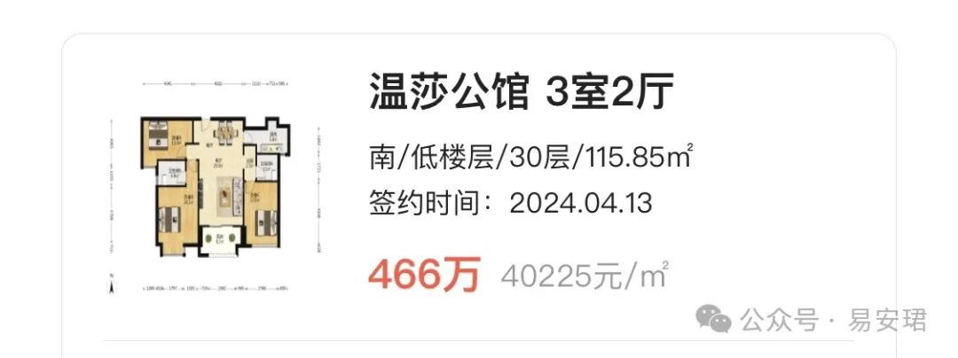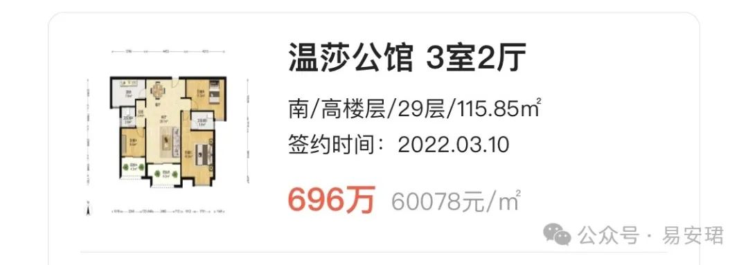 12、湖里金尚板块——温莎公馆,115.85平3房,成交单价40225元/平,成交总价466万;2022年同户型成交单价60078元/平,成交总价696万;只隔了2年时间,总价调整了230万。