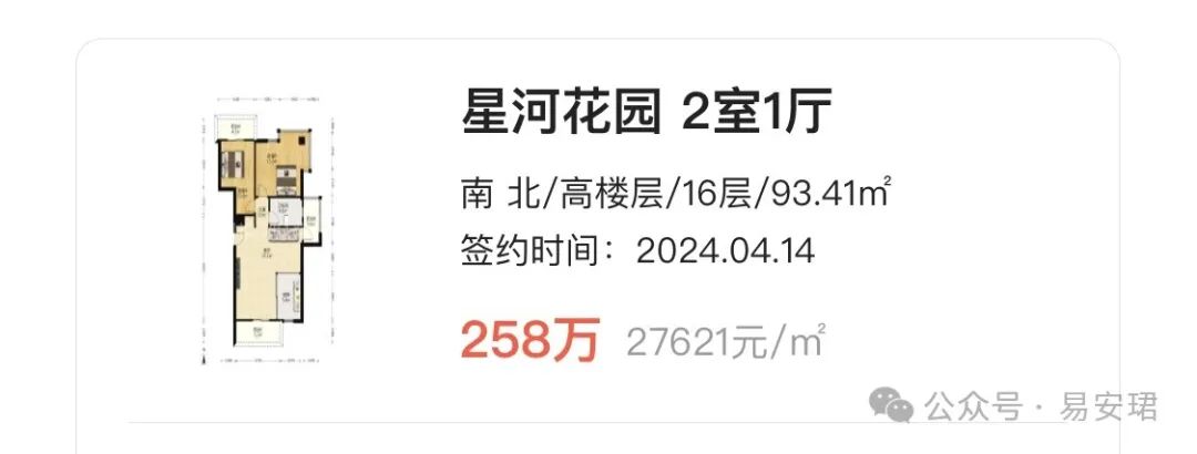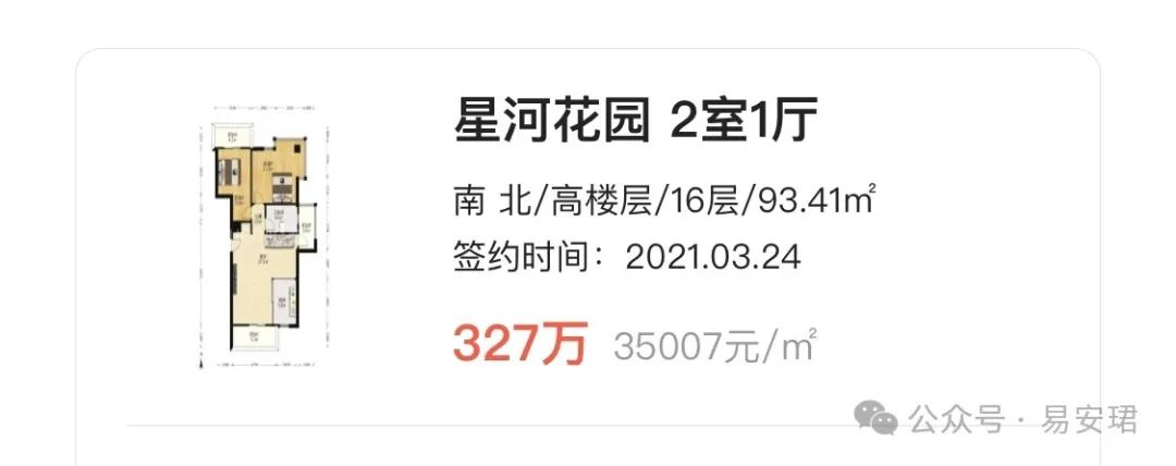 7、海沧生活区——星河花园;93.41平2房,成交单价27621元/平,成交总价258万;2021年同户型成交单价35007元/平,成交总价327万;3年时间,总价调整了69万。