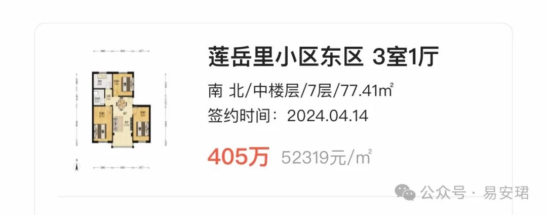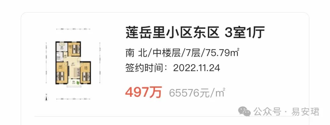 3、思明松柏——莲岳里小区东区,77.41平3房,成交单价52319元/平,成交总价405万;2022年11月相似户型成交单价65576元/平,成交总价497万;只隔一年半时间,总价调整了92万。