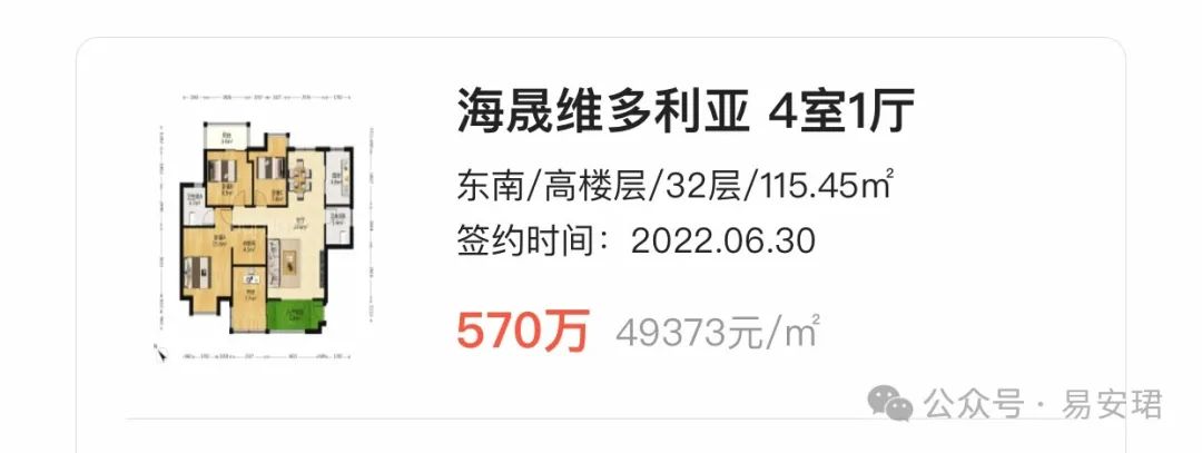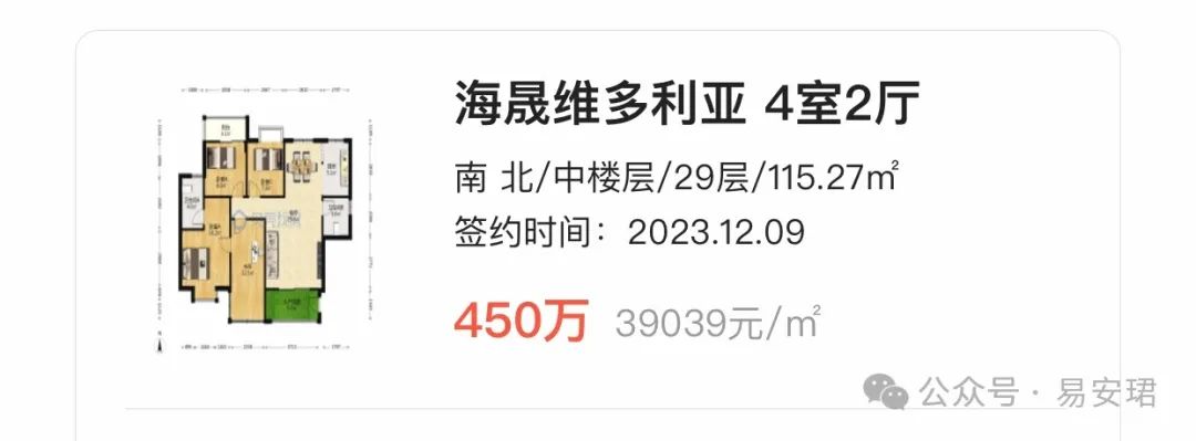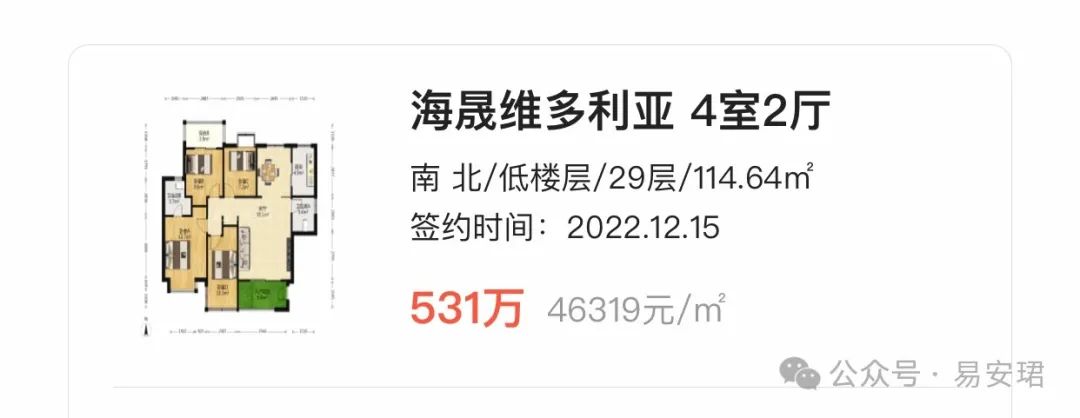 2、海沧滨海社区——海晟维多利亚,115.27平4房,成交单价36697元/平,成交总价423万;2013年12月相似户型成交单价39039元/平,成交总价450万,只隔4个月时间,总价调整了27万。2022年12月相似户型成交单价46319元/平,成交总价531万,只隔了1年半时间,总价调整了108万。