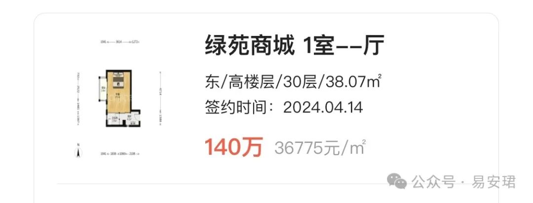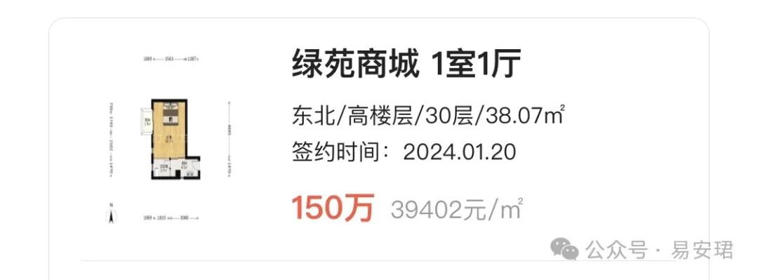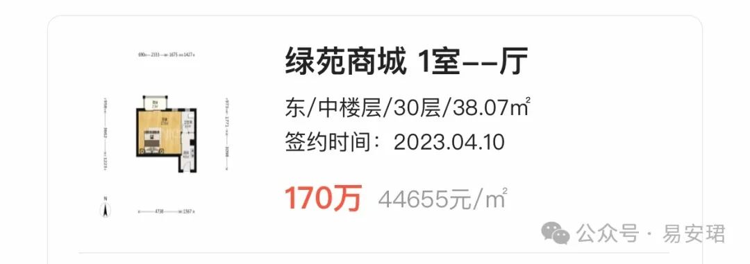 5、海沧滨海社区——绿苑商城,38.07平1房,成交单价36775元/平,成交总价140万;1月份同户型成交单价39402元/平,成交总价150万;只隔了3个月,总价调整了10万。2023年同户型成交单价44655元/平,成交总价170万,只隔了1年时间总价调整了30万。