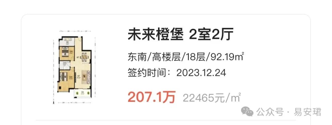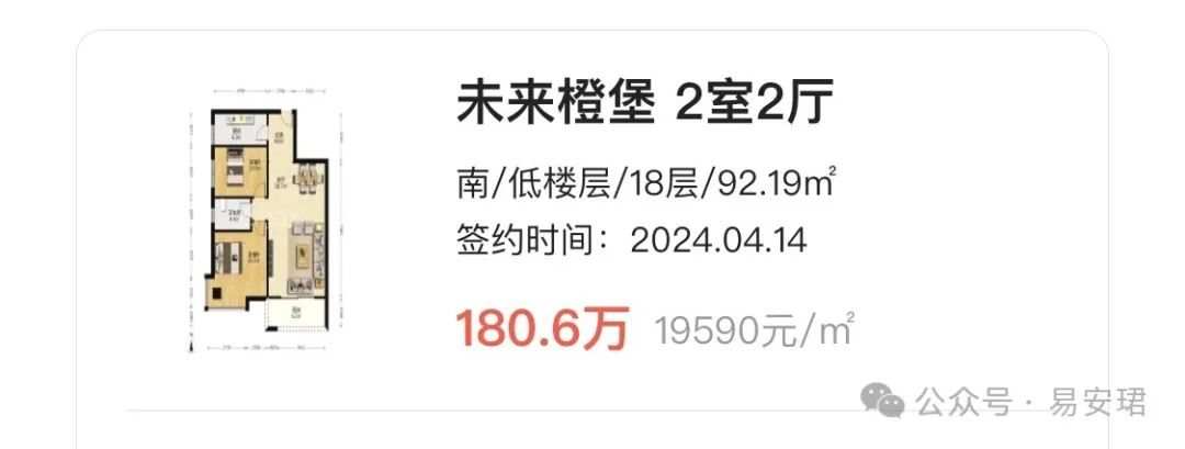 9、海沧体育中心——未来橙堡;92.19平2房,成交单价19590元/平,成交总价180.6万;去年12月同户型成交单价207.1万;只隔了4个月,总价调整了26.5万。