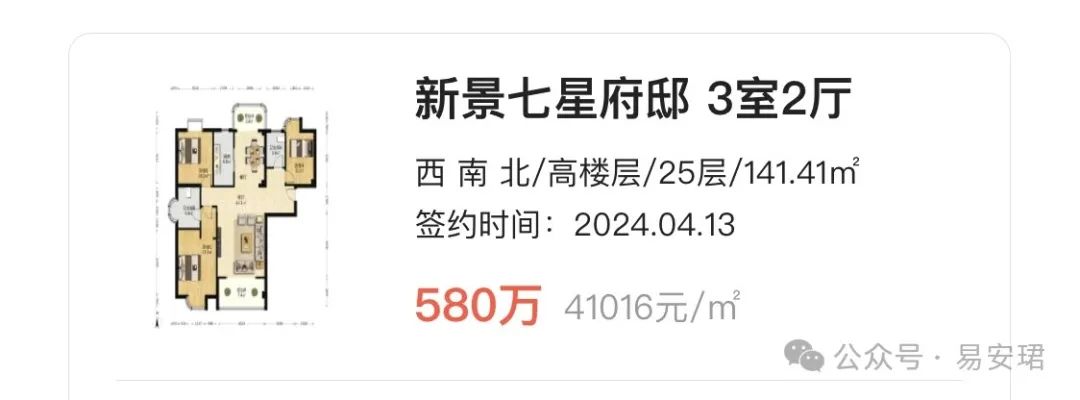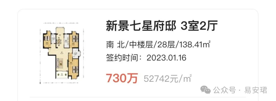 10、湖里金尚板块——新景七星府邸,141.41平3房,成交单价41016元/平,成交总价580万;去年年初相似户型成交单价52742元/平,成交总价730万;只隔了1年时间,总价调整了150万左右。